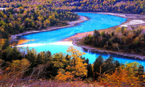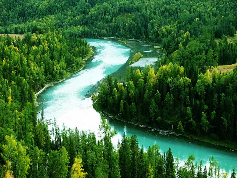 月亮湾是喀纳斯景区里的又一精品,从卧龙湾北上1公里,站在盘山路上向下鸟瞰,你就可以见到风景如诗如画令人百看不厌的月亮湾了。月亮湾夹在东西两山之间,河道随山势迂回,恰似一牙初升的新月。这弯“新月也会随着观察角度和季节的不同而各具神韵。