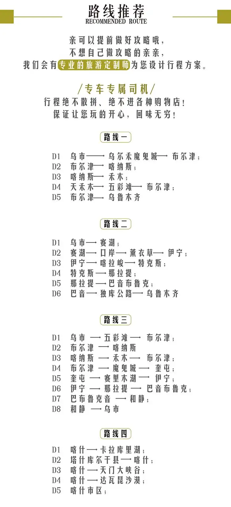 行程抵达:乌鲁木齐,阿勒泰,伊犁,喀什,吐鲁番,昌吉,库尔勒,克拉玛依